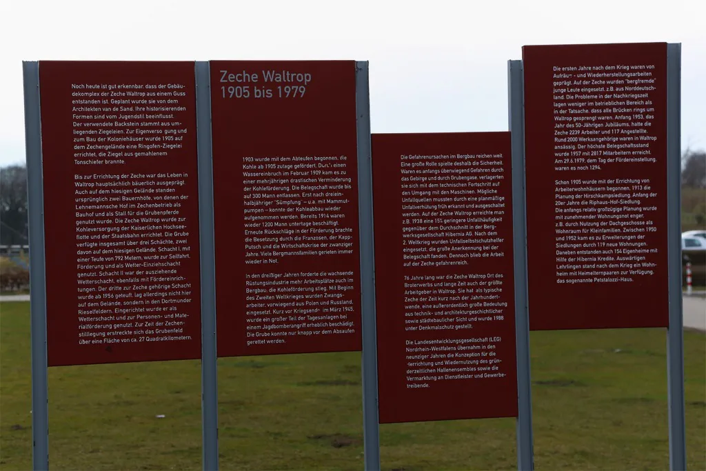 Die 1905 erbaute Zeche Waltrop gilt als eine der schönsten Anlagen Ihrer Art im Ruhrgebiet. Ihr Betriebsbeginn war 1905 und Ihr Betriebsende 1979. In den 74 Jahren wurde stetig erweitert. Die höchste Förderung der Zeche wurde mit 1,13 Millionen Tonnen Kohle im Jahr 1974 erreicht.
